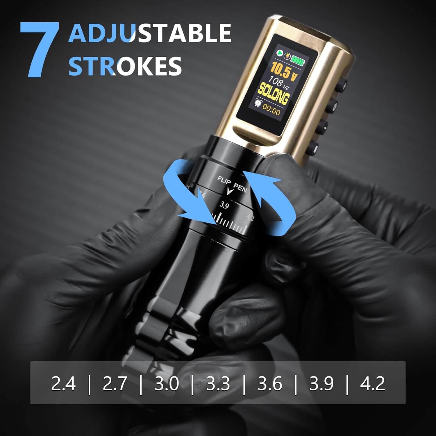 The LED display clearly shows voltage, run time, and battery level. With 7 adjustable stroke lengths (2.4mm–4.2mm), it adapts easily to lining, shading, and color packing.